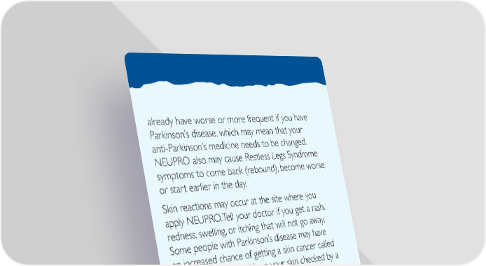 already have worse or more frequent if you have Parkinson’s disease, which may mean that your anti-Parkinson’s medicine needs to be changed. NEUPRO also may cause Restless Legs Syndrome symptoms to come back (rebound), become worse, or start earlier in the day. Skin reactions may occur at the site where you apply NEUPRO. Tell your doctor if you get a rash, redness, swelling, or itching that will not go away. Some people with Parkinson’s disease may have an increased chance of getting a skin cancer called melanoma. You should have your skin checked by a doctor regularly. Avoid exposing the NEUPRO patch you are wearing to heating pads, electric blankets, heat lamps, saunas, hot tubs, heated water beds, and direct sunlight. Too much medicine could be absorbed into your body. Also, do not wear NEUPRO during medical procedures called magnetic resonance imaging (MRI) or cardioversion because this could cause skin burns. Tell your doctor if you have breathing problems, a sleep disorder, mental problems, high or low blood