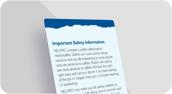 Important Safety Information NEUPRO contains a sulfite called sodium metabisulfite. Sulfites can cause severe allergic reactions that are life threatening to some people who are sensitive to sulfites. People with asthma are more sensitive to sulfites. Remove the patch right away and call your doctor if you have swelling of the lips or tongue, chest pain, or trouble breathing or swallowing. NEUPRO may make you fall asleep suddenly or without warning while doing normal activities, such as driving, which may result in accidents. Tell your doctor right away if this happens. Drinking alcohol or taking other medicines that cause drowsiness may increase your chances of becoming sleepy while using NEUPRO. Do not drive, use hazardous machinery, or do other dangerous activities until you know how NEUPRO affects you. NEUPRO can cause or worsen psychotic symptoms including hallucinations (seeing or hearing things that are not real), confusion, excessive suspicion, aggressive behavior, agitation, delusional beliefs (believing things that are not real), and disorganized