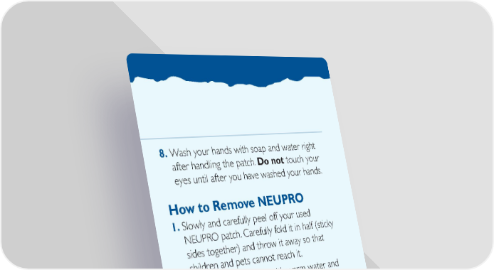 8. Wash your hands with soap and water right after handling the patch. Do not touch your eyes until after you have washed your hands. How to Remove NEUPRO 1. Slowly and carefully peel off your used NEUPRO patch. Carefully fold it in half (sticky sides together) and throw it away so that children and pets cannot reach it. 2. Gently wash the area with warm water and mild soap to remove any sticky material (adhesive) that stays on the skin. 3. Baby or mineral oil may also be used to remove any adhesive. Avoid using alcohol or other solvents, such as nail polish remover. They may cause your skin to become irritated. 4. Wash your hands with soap and water. 5. You may see mild redness at the site when a patch is removed, like when you remove an adhesive bandage. This redness should go away over time. If irritation or itchiness continues, tell your doctor.