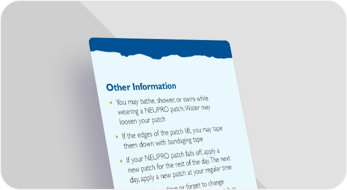 Other Information You may bathe, shower, or swim while • wearing a NEUPRO patch. Water may loosen your patch If the edges of the patch lift, you may tape • them down with bandaging tape If your NEUPRO patch falls off, apply a • new patch for the rest of the day. The next day, apply a new patch at your regular time If you miss a dose or forget to change • your NEUPRO patch, apply a new patch as soon as you remember. The next day, apply a new patch at your normal time