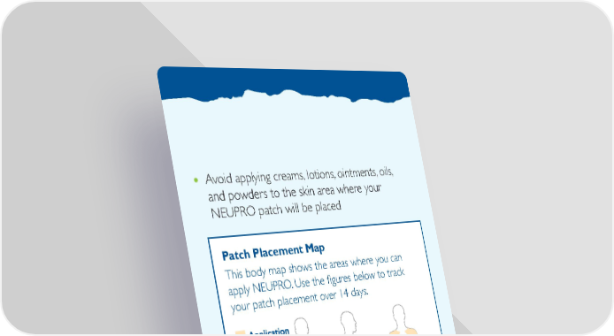 • Avoid applying creams, lotions, ointments, oils, and powders to the skin area where your NEUPRO patch will be placed Patch Placement Map This body map shows the areas where you can apply NEUPRO. Use the figures below to track your patch placement over 14 days. For more information and a video about how to apply the NEUPRO patch, please visit www.NEUPRO.com