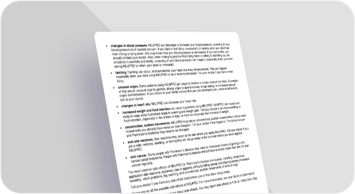 • changes in blood pressure. NEUPRO can decrease or increase your blood pressure. Lowering of your blood pressure is of special concern. If you faint or feel dizzy, nauseated, or sweaty when you stand up from sitting or lying down, this may mean that your blood pressure is decreased. If you notice this, you should contact your doctor. Also, when changing position from lying down or sitting to standing up, you should do it carefully and slowly. Lowering of your blood pressure can happen, especially when you start taking NEUPRO or when your dose is increased. • fainting. Fainting can occur, and sometimes your heart rate may be decreased. This can happen especially when you start using NEUPRO or your dose is increased. Tell your doctor if you faint or feel dizzy. • unusual urges. Some patients using NEUPRO get urges to behave in a way unusual for them. Examples of this are an unusual urge to gamble, strong urges to spend money, binge eating, or increased sexual urges and behaviors. If you notice or your family notices that you are developing any unusual behaviors, talk to your doctor. • changes in heart rate. NEUPRO can increase your heart rate. • increased weight and fluid retention can occur in patients using NEUPRO. NEUPRO can cause your body to keep extra fluid which leads to swelling and weight gain. Tell your doctor if you have swelling or fluid retention, especially in the ankles or legs, or have an unusually fast increase in weight. • uncontrolled, sudden movements. NEUPRO may cause uncontrolled, sudden movements or make such movements you already have worse or more frequent. Tell your doctor if this happens. The doses of your anti-Parkinson’s medicine may need to be changed. • skin site reactions. Skin reactions may occur at the site where you apply NEUPRO. Tell your doctor if you get a rash, redness, swelling, or itching that will not go away at the skin site where you have applied NEUPRO. • skin cancer. Some people with Parkinson’s disease may have an increased chance of getting a skin cancer called melanoma. People with Parkinson’s disease should have a doctor check their skin for skin cancer regularly. The most common side effects of NEUPRO for Parkinson’s disease are nausea, vomiting, sleepiness, application site reactions, dizziness, loss of appetite, difficulty falling asleep and staying asleep, increased sweating, vision problems, leg swelling, and uncontrolled, sudden movements of arms or legs. Tell your doctor if you have any side effect that bothers you or that does not go away. These are not all the possible side effects of NEUPRO. For more information, ask your doctor or pharmacist. Call your doctor for medical advice about side effects. You may report side effects to FDA at 1-800-FDA-1088. How should I store NEUPRO? • Store NEUPRO at 68°F to 77°F (20°C to 25°C). • Store NEUPRO in its original sealed pouch until use. Do not store NEUPRO outside of the pouch. Keep NEUPRO and all medicines out of reach of children and away from pets. General information about the safe and effective use of NEUPRO. Medicines are sometimes prescribed for purposes other than those listed in a Patient Information leaflet. Do not use NEUPRO for a condition for which it was not prescribed. Do not give NEUPRO to other people even if they have the same symptoms you have. It may harm them. This Patient Information leaflet summarizes the most important information about NEUPRO. If you would like more information, talk with your doctor. You can ask your pharmacist or doctor for information about NEUPRO that was written for health professionals. For more information, go to www.neupro.com or call 1-844-599-2273.