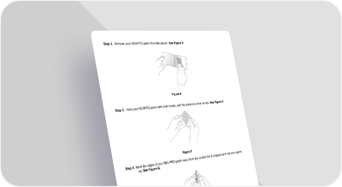 Step 2. Remove your NEUPRO patch from the pouch. See Figure E. Figure E Step 3. Hold your NEUPRO patch with both hands, with the protective liner on top. See Figure F. Figure F Step 4. Bend the edges of your NEUPRO patch away from you so that the S-shaped cut in the liner opens up. See Figure G. Figure G