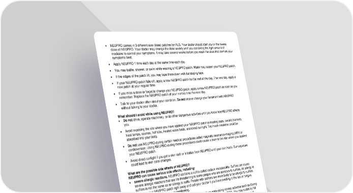 • NEUPRO comes in 3 different size (dose) patches for RLS. Your doctor should start you on the lowest dose of NEUPRO. Your doctor may change the dose weekly until you are taking the right amount of medicine to control your symptoms. It may take several weeks before you reach the dose that controls your symptoms best. • Apply NEUPRO 1 time each day at the same time each day. • You may bathe, shower, or swim while wearing a NEUPRO patch. Water may loosen your NEUPRO patch. • If the edges of the patch lift, you may tape them down with bandaging tape. • If your NEUPRO patch falls off, apply a new NEUPRO patch for the rest of the day. The next day, apply a new patch at your regular time. • If you miss a dose or forget to change your NEUPRO patch, apply a new NEUPRO patch as soon as you remember. Replace the NEUPRO patch at your normal time the next day. • Talk to your doctor often about your condition. Do not stop or change your treatment with NEUPRO without talking to your doctor. What should I avoid while using NEUPRO? • Do not drive, operate machinery, or do other dangerous activities until you know how NEUPRO affects you. • Avoid exposing the site where you have applied your NEUPRO patch to heating pads, electric blankets, heat lamps, saunas, hot tubs, heated water beds, and direct sunlight. Too much medicine could be absorbed into your body. • Do not use NEUPRO during certain medical procedures called magnetic resonance imaging (MRI) or cardioversion. Using NEUPRO during these procedures could cause a burn to the site where you applied your NEUPRO patch. • Avoid direct sunlight if you get a skin rash or irritation from NEUPRO until your skin heals. Sun exposure could lead to skin color changes. What are the possible side effects of NEUPRO? NEUPRO can cause serious side effects, including: • severe allergic reactions. NEUPRO contains a sulfite called sodium metabisulfite. Sulfites can cause severe allergic reactions that are life threatening to some people who are sensitive to sulfites. An allergy to sulfites is not the same as an allergy to sulfa. People with asthma are more likely to be allergic to sulfites. Remove your NEUPRO patch right away and call your doctor if you have swelling of the lips or tongue, chest pain, trouble breathing or swallowing. • falling asleep during normal activities. You may fall asleep while doing normal activities such as driving a car, doing physical tasks, or using hazardous machinery while taking NEUPRO. You may suddenly fall asleep without being drowsy or without warning. This may result in having accidents. Your chances of falling asleep while doing normal activities while using NEUPRO are greater if you take other medicines that cause drowsiness. Tell your doctor right away if this happens. Before starting NEUPRO, be sure to tell your doctor if you take any medicines that make you drowsy. • changes in blood pressure. NEUPRO can decrease or increase your blood pressure. Lowering of your blood pressure is of special concern. If you faint or feel dizzy, nauseated, or sweaty when you stand up from sitting or lying down, this may mean that your blood pressure is decreased. If you notice this, you should contact your doctor. Also, when changing position from lying down or sitting to standing up, you should do it carefully and slowly. Lowering of your blood pressure can happen, especially when you start taking NEUPRO or when your dose is increased. • fainting. Fainting can occur, and sometimes your heart rate may be decreased. This can happen especially when you start using NEUPRO or your dose is increased. Tell your doctor if you faint or feel dizzy.