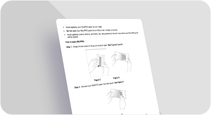 • Avoid applying your NEUPRO patch on skin folds. • Do not apply your NEUPRO patch to skin that is red, irritated, or injured. • Avoid applying creams, lotions, ointments, oils, and powders to the skin area where your NEUPRO patch will be placed. How to apply NEUPRO: Step 1. Grasp the two sides of the pouch and pull apart. See Figures C and D. Figure C Figure D Step 2. Remove your NEUPRO patch from the pouch. See Figure E. Figure E Step 3. Hold your NEUPRO patch with both hands, with the protective liner on top. See Figure F. Figure F