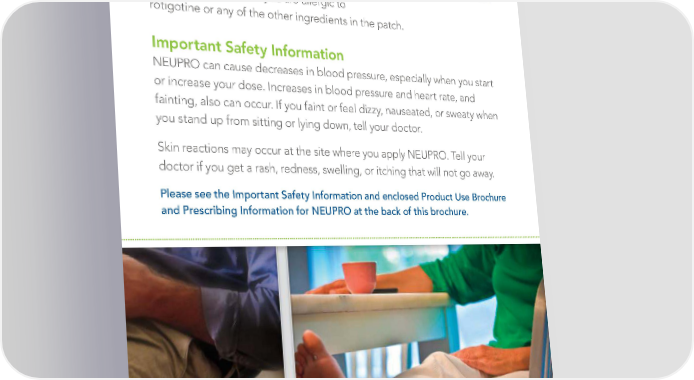In fact, nearly 1 out of 4 patients (23%) taking NEUPRO were completely symptom free at the NEUPRO is end of the study (compared to nearly 1 out a once a day of 10 patients (9%) who used a placebo patch, patch that without any medicine). In other words, these provides patients had a score of zero on all 10 items, medicine which means no symptoms. for 24 hours. Do not use NEUPRO if you are allergic to rotigotine or any of the other ingredients in the patch. Important Safety Information NEUPRO can cause decreases in blood pressure, especially when you start or increase your dose. Increases in blood pressure and heart rate, and fainting, also can occur. If you faint or feel dizzy, nauseated, or sweaty when you stand up from sitting or lying down, tell your doctor. Skin reactions may occur at the site where you apply NEUPRO. Tell your doctor if you get a rash, redness, swelling, or itching that will not go away. Please see the Important Safety Information and enclosed Product Use Brochure and Prescribing Information for NEUPRO at the back of this brochure. This is NEUPRO for RLS 7 |