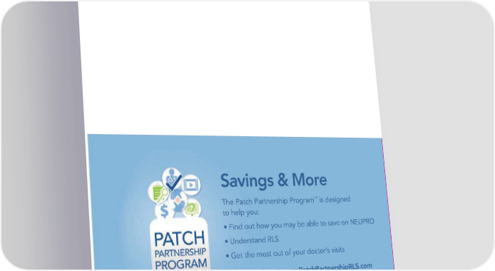 Savings & More ™ The Patch Partnership Program is designed to help you: • Find out how you may be able to save on NEUPRO • Understand RLS • Get the most out of your doctor’s visits Sign up today at www.PatchPartnershipRLS.com INSIDE: Please see the enclosed Product Use Brochure and Prescribing Information for NEUPRO. .NEUPRORLS.comwww . e d i s n i O R UP E N r o f ed. USP-NR-0515-00006eserv All rights r on ati m or f n I g n i b i r c s e r P d n a e r u h c o r B A 30080. ©2015 UCB, Inc., Smyrna, G oup of Companies. of the UCB Gr e Ust c u d o r P , on ati m or f n I ademarks, e tr am™ ar ogr atient Savings PrP y t e t Saf n a t r o p m e I h e t e e s s a le P am™ and NEUPROogr ship Pr artner ch P at P ademark, and ed tr ert egis is a r® NEUPRO .estrictions, terms, and conditions apply*Eligibility r . y da e thr e i l r a e .NEUPROSavingsRLS.comat www t r a t r s n o e s r o , w n r u t e t r a h s t m o t p m y S s L d R n a *for as low as $10 a month for 12 months , s n o i t c a e e rt i in s k , s s e g r l u a u s nu , u g in t in a , f e t a r See how you may be able to get NEUPRO t r a e d h n e a r u s s e r d p o o l s in be s a e r c e r d s o e s a e r c in , s e i t i v i t c l a ma r o g n in r u p d e e l s g a inl l a , f e t fi l u s i b a t e m m u di o s t en di e r ng i he t o t s oni t ac e r c gi erl l a e er v e s g in d u l c s int c e f f e e d i s s u o i r e e s s au n c a O c R P U E N on i at m or f n I y et af S t n a t por m I . 8 8 0 1 - A D F - 0 0 8 - l 1l a r c h o c t a w d e m / v o g . a d f . w w t wi s i . V A D e F h o tt s g u r n d o i t p i r c s e r f p s o t c e f f e e d i e s v i t a g e t n r o p e o r d t e g a r u o c n e er u a o Y m co S. L R O R P U E N . w w w t a ™ m a r g ro P ip h s r e n t r a h P c t a e P h r t o p f n u g i d s n e a r n mo r a e L . y l p p s a n o i t i d n o d c n , a s m r e , ts n o i t c i r t s e y rt i l i b i g i l E * 4/8/14 6:53 AM 80407-2_760_39244_CoPayBckr_KLG.indd 1 030455-0314ATG-PRM-R 2014.y 28,ebruar–F 2014y 1,uareen Janocessed betw†Based on >5,000 claims pr ed.v eser GA 30080. All rights ryrna,., Sm Inc©2014 UCB, m o c . S L R s g n i v Sa O R P U E N . w w t w * a s h t n o 2 m r 1 o h ft n o 0 a m 1 $ oup of Companies. of the UCB Gr is a trademark,™ogramvings PrSa o Patient and the Neupred trademark,egister is a r®oNeupr3 6 2 0 1- 4 8- 5 5 8 1- . without notice y time ogram at an es the right to change or cancel this prveserUCB r . et expenseerms and Conditions.Tditional um $10 out-of-pockor ad.com fo.neupror at least a minimd or wwwesponsible fe rerse side of carveEligible patients ar*See rt a™margors Pgnivat Sneitao PrpueN s w a o s l r a o O f R P U E t N e o g le t b e a y b a u m o w y o e h e S -0263 -855-8411 e h l tla , cdra e ch e ttavitc o aT or the next 12 months*F call d, o activate this carT d Car vings atient SaP † ™ ma rg o r s Pgniva t Sneit a o Prpue N (80840)ISSUER: e h h tti h wtno a m0 1$ d aip er f f O s g n vi a S 50776476RxGRP: S T N E I T A LE PBI G LI E yalty Lo RxPCN: OF % 80 LY R A E N 610524RxBIN: .dra e ccnarusnn it aon ss iih. Tswae ltatd snl aareded fns aelum rargoro pt tnausrud pesnepsit dcudor. Pway ld betibihore psiwrehte orehr w, o)ocio RtreuP n e ilbaliavn aale Pcnarusnh Itlaet Hnemnrevoe Ghd tns amargore pcnatsissg aurn doitpircsere ptaty sng anidulcnis (margord pednuf etatr sl oareder falimiy sn, adiacide, M)t Drag Pnidulcnie (racider Medn, utrar pe olohn w, idesrubmiee rrt aahs tnoitpircserr pod filat vo N* : nsoitndio Cnd asmreT S L R y r a m i r p re ve e s . y time without noticegram at ano es the right to amend or terminate this prveserUCB r erms and Conditions.Tditional or ad.com fo.neuprd or wwwvings Caratient Sao P erse side of NeuprveSee r S.LRr o fOPRUEN isisTh omc. p hisr net r a P h c t a Pt as uni o J - o t - e t a r e d o n m f i e i l e m r o t p m y s . ™ m ar g or p Pihsr en tr a h Pcta ur P h ogu o hr n toitid n o ur co e ygan a m p le o h s tec uros e l rufple d hn , aslo o , tspi t tro p p e suviece n ra u co , ysgniv a s sedis e B e t le p m o r c o l f a i t n e t o n p e v o r P • n oi ptircs e r pru o y ng illin f he y wca m ra h r puo t ya d r a Csg ni v a t Snei at ro Ppu e N .tese rt mel he t tnes er P ngi s o d y l ai d - e c n O • * O PR U E f N s oht on 2 m t 1xe e nh r tof dluoy wehsh tit wsuI j n o i t a c i d e s m u uo n i t n o f c s o r u o 4 h 2 • h t n o 0 a m1 s $ w a o l s a y a P .evitce ae bp mley heTh gs.ee lre asehT . S L r R o O f R P U E s N s i i h T . s g e le r e a s e h T ome..e primary Restless Legs Syndreat moderate-to-severused to tr escription medicineotigotine transdermal system) is a pr (r®NEUPRO