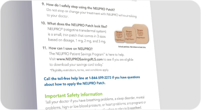 Patients should report application site reactions that do not go away after a few days, that get worse, or that spread outside the patch site. If there is a skin rash or irritation from the patch, direct sunlight on the area should be avoided until the skin heals. Exposure could lead to changes in skin color. The NEUPRO Patch Placement Tracker can help you rotate your application site every day. Visit www.NEUPRORLS.com to download Patch Images Note to designers: When using more than one group of patches in the Tracker now. a layout, please be sure to scale the images uniformly. 9. How do I safely stop using the NEUPRO Patch? All files are CMYK format, please convert to rgb for web. Do not stop or change your treatment with NEUPRO without talking to your doctor. 10. What does the NEUPRO Patch look like? ® NEUPRO (rotigotine transdermal system) is a small, thin patch that comes in 3 sizes based on dosage, 1 mg, 2 mg, and 3 mg. Actual patches. Not shown actual size. 11. How can I save on NEUPRO? ™ The NEUPRO Patient Savings Program is here to help. Visit www.NEUPROSavingsRLS.com to see if you are eligible * to download your savings card today. *Eligibility restrictions, terms, and conditions apply. Call the toll-free help line at 1-844-599-2273 if you have questions about how to apply the NEUPRO Patch. Important Safety Information Tell your doctor if you have breathing problems, a sleep disorder, mental problems, high or low blood pressure, or heart problems; are pregnant or plan to become pregnant; or are breastfeeding or plan to breastfeed. NEUPRO may not be right for you. The most common side effects in people taking NEUPRO for Restless Legs Syndrome are application site reactions, nausea, difficulty falling asleep and staying asleep, sleepiness, and headache. Please see the Important Safety Information and enclosed Product Use Brochure and Prescribing Information for NEUPRO at the back of this brochure. This is NEUPRO for RLS 13 |