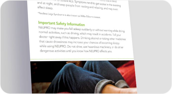 What Is RLS? * Restless Legs Syndrome (RLS) is a neurological disorder that results in a powerful urge to move your legs (and, sometimes, other parts of your body). RLS affects up to 23 million American adults; it is estimated that a third have moderate-to-severe RLS. Symptoms tend to get worse in the evening and at night, and keep people from resting and relaxing, and may even affect sleep. *Restless Legs Syndrome is also known as Willis-Ekbom disease. Important Safety Information NEUPRO may make you fall asleep suddenly or without warning while doing normal activities, such as driving, which may result in accidents. Tell your doctor right away if this happens. Drinking alcohol or taking other medicines that cause drowsiness may increase your chances of becoming sleepy while using NEUPRO. Do not drive, use hazardous machinery, or do other dangerous activities until you know how NEUPRO affects you. These are legs. They keep me moving. Even when I am trying to sleep.