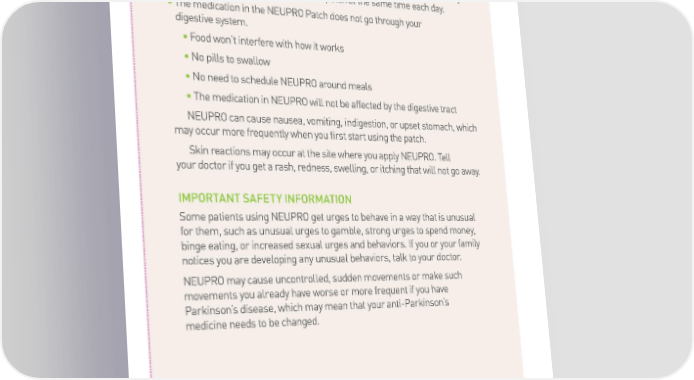 WHY a patch may be right for you. ® • NEUPRO Žrotigotine transdermal system‘ provides stable continuous delivery 24 hours a day so you get a consistent level of medication throughout the day. • †he NEUPRO Patch offers oncedaily dosing. ‹imply choose the time of day that ors best for you and apply the patch at the same time each day. • †he medication in the NEUPRO Patch does not go through your digestive system. • ”ood on’t interfere ith ho it ors • No pills to sallo • No need to schedule NEUPRO around meals • †he medication in NEUPRO ill not be affected by the digestive tract NEUPRO can cause nausea vomiting indigestion or upset stomach hich may occur more fre•uently hen you first start using the patch. ‹in reactions may occur at the site here you apply NEUPRO. †ell your doctor if you get a rash redness selling or itching that ill not go aay. IMPORTANT SAFETY INFORMATION ‹ome patients using NEUPRO get urges to behave in a ay that is unusual expressing myself for them such as unusual urges to gamble strong urges to spend money binge eating or increased se€ual urges and behaviors. f you or your family notices you are developing any unusual behaviors tal to your doctor. NEUPRO may cause uncontrolled sudden movements or mae such movements you already have orse or more fre•uent if you have Parinson’s disease hich may mean that your antiParinson’s medicine needs to be changed.