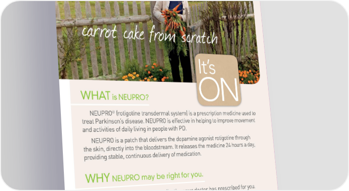 What does It’s ON mean to me? carrot cake from scratch It’s WHAT is NEUPRO? ON ® NEUPRO Žrotigotine transdermal system‘ is a prescription medicine used to treat Parinson’s disease. NEUPRO is effective in helping to improve movement and activities of daily living in people ith P. NEUPRO is a patch that delivers the dopamine agonist rotigotine through the sin directly into the bloodstream. t releases the medicine 24 hours a day providing stable continuous delivery of medication. WHY NEUPRO may be right for you. NEUPRO may be the first medication your doctor has prescribed for you. Or your doctor may be maing a change because you’ve reached a point here your symptom control isn’t hat it used to be. Or you may feel your medication isn’t helping enough. †his is hen an honest conversation ith your doctor becomes so important to decide if the NEUPRO Patch is right for you. Please see the Important Safet Information an enclose Proct se rochre an Prescriing Information for NEPRO at the ac of this rochre