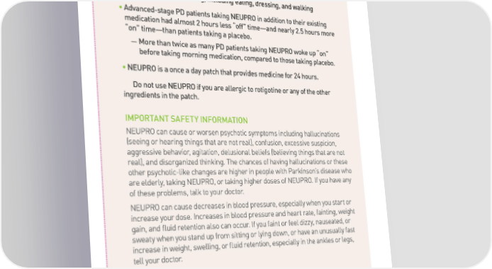 With NEUPRO, It’s ON in so many ways, because: • Earl€stage P‚ patients ta ing NEPRO saƒ significant impro…ement in Par inson’s smptoms throgh a comine measre of† — Motor fnctions‡ sch as tremors‡ stiffness‡ sloƒness‡ an prolems ƒith alance‡ an — Acti…ities of ail li…ing‡ incling eating‡ ressing‡ an ƒal ing • A…ance€stage P‚ patients ta ing NEPRO in aition to their eˆisting meication ha almost ‰ hors less “off” time—an nearl ‰Ž hors more “on” time—than patients ta ing a placeo — More than tƒice as man P‚ patients ta ing NEPRO ƒo e p “on” efore ta ing morning meication‡ compare to those ta ing placeo • NEPRO is a once a a patch that pro…ies meicine for ‰‘ hors ‚o not se NEPRO if o are allergic to rotigotine or an of the other ingreients in the patch IMPORTANT SAFETY INFORMATION NEUPRO can cause or orsen psychotic symptoms including hallucinations Žseeing or hearing things that are not real‘ confusion e€cessive suspicion aggressive behavior agitation delusional beliefs Žbelieving things that are not real‘ and disorgani‡ed thining. †he chances of having hallucinations or these other psychoticlie changes are higher in people ith Parinson’s disease ho are elderly taing NEUPRO or taing higher doses of NEUPRO. f you have any of these problems tal to your doctor. NEUPRO can cause decreases in blood pressure especially hen you start or increase your dose. ncreases in blood pressure and heart rate fainting eight gain and fluid retention also can occur. f you faint or feel di‡‡y nauseated or seaty hen you stand up from sitting or lying don or have an unusually fast increase in eight selling or fluid retention especially in the anles or legs tell your doctor.