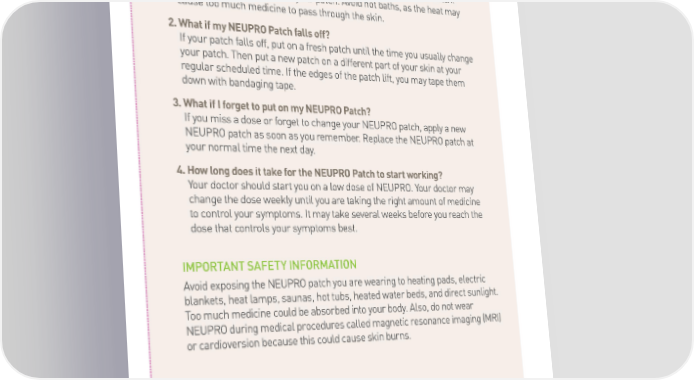 FAQs. Frequently asked questions about ® NEUPRO (rotigotine transdermal system). 1. Can I get my NEUPRO Patch wet? šes. šou can bathe shoer or sim hile earing the NEUPRO Patch. ›oever ater may loosen your patch. Avoid hot baths as the heat may cause too much medicine to pass through the sin. 2. What if my NEUPRO Patch falls off? f your patch falls off put on a fresh patch until the time you usually change your patch. †hen put a ne patch on a different part of your sin at your regular scheduled time. f the edges of the patch lift you may tape them don ith bandaging tape. 3. What if I forget to t on my NEUPRO Patch? f you miss a dose or forget to change your NEUPRO patch apply a ne NEUPRO patch as soon as you remember. Replace the NEUPRO patch at your normal time the ne€t day. . ow long oes it tae for the NEUPRO Patch to start woring? šour doctor should start you on a lo dose of NEUPRO. šour doctor may change the dose eely until you are taing the right amount of medicine to control your symptoms. t may tae several ees before you reach the dose that controls your symptoms best. IMPORTANT SAFETY INFORMATION Avoid e€posing the NEUPRO patch you are earing to heating pads electric blanets heat lamps saunas hot tubs heated ater beds and direct sunlight. †oo much medicine could be absorbed into your body. Also do not ear NEUPRO during medical procedures called magnetic resonance imaging ŽR‘ or cardioversion because this could cause sin burns.