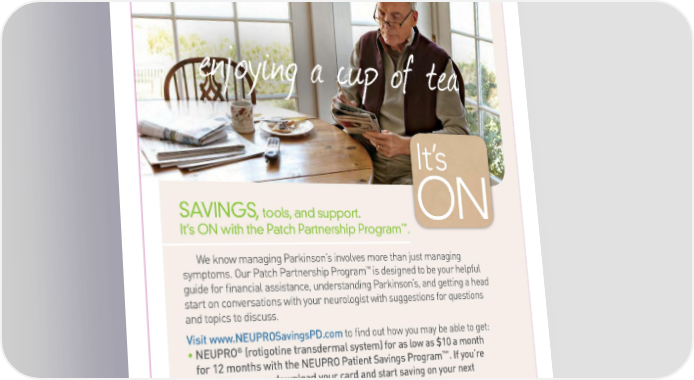 What does It’s ON mean to me? enjoying a cup of tea It’s SAVINGS, tools, and support. ON ™ It’s ON with the Patch Partnership Program . –e no managing Parinson’s involves more than —ust managing ™ symptoms. Our Patch Partnership Program is designed to be your helpful guide for financial assistance understanding Parinson’s and getting a head start on conversations ith your neurologist ith suggestions for •uestions and topics to discuss. ’isit ƒƒƒNEPROSa…ingsP‚com to find out ho you may be able to get™ ® • NEPRO ”rotigotine transermal sstem• for as loƒ as –—˜ a month ™™ for —‰ months ƒith the NEPRO Patient Sa…ings Program If o’re eligile‡ o can oƒnloa or car an start sa…ing on or neˆt NEPRO prescription Š Eligibility restrictions terms and conditions apply. Please see the Important Safet Information an enclose Proct se rochre an Prescriing Information for NEPRO at the ac of this rochre