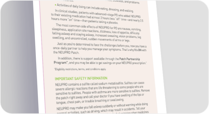 It’s ON because the NEUPRO Patch delivers 24 hours of continuous medicine. And NEUPRO helps improve both motor symptoms and activities of daily living. n clinical trials earlystage P patients taing NEUPRO sa improvement in their Parinson’s symptoms measured by a combination of motor function and activities of daily living. otor function can include tremors stiffness sloness and problems • ith balance. Activities of daily living can include eating dressing and aling. • n clinical studies patients ith advancedstage P ho added NEUPRO to their e€isting medication had almost 2 hours less “off” time—and nearly 2.… hours more “on” time—than patients taing a placebo. †he most common side effects of NEUPRO for P are nausea vomiting sleepiness application site reactions di‡‡iness loss of appetite difficulty falling asleep and staying asleep increased seating vision problems leg selling and uncontrolled sudden movements of arms or legs. ‰ust as you’re determined to face the challenges before you no you have a oncedaily partner to help you manage your symptoms. †hat’s hy It’s ON ith the NEUPRO Patch. n addition there is support available through the Patch Partnership ™ Š Program and you may be able to get savings on your NEUPRO prescription. Š Eligibility restrictions terms and conditions apply. IMPORTANT SAFETY INFORMATION NEUPRO contains a sulfite called sodium metabisulfite. ‹ulfites can cause severe allergic reactions that are life threatening to some people ho are sensitive to sulfites. People ith asthma are more sensitive to sulfites. Remove the patch right aay and call your doctor if you have selling of the lips or tongue chest pain or trouble breathing or salloing. NEUPRO may mae you fall asleep suddenly or ithout arning hile doing normal activities such as driving hich may result in accidents. †ell your doctor right aay if this happens. rining alcohol or taing other medicines that cause drosiness may increase your chances of becoming sleepy hile using NEUPRO. o not drive use ha‡ardous machinery or do other dangerous activities until you no ho NEUPRO affects you.